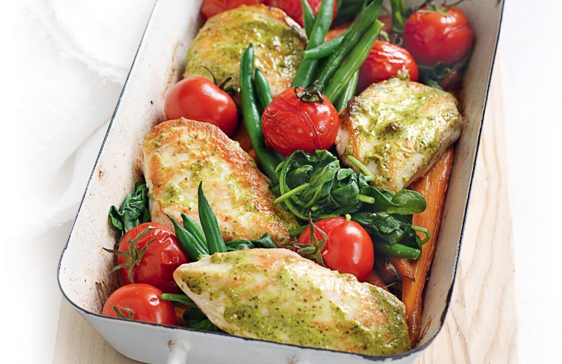 Chicken thighs coated in pesto, roasted until juicy and slightly crispy. Minimal washing up. Maximum reward.