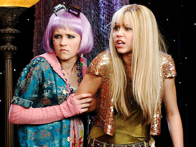 Producers cited Gwen’s edgy glam and Hilary’s wholesome pop vibe as the style blueprint for Hannah’s look. Think: layered skirts, funky boots, and LOTS of rhinestones.