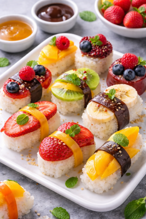 You are welcome to experiment with different fruits and toppings to create unique fruit and sushi combinations. Bon appétit!